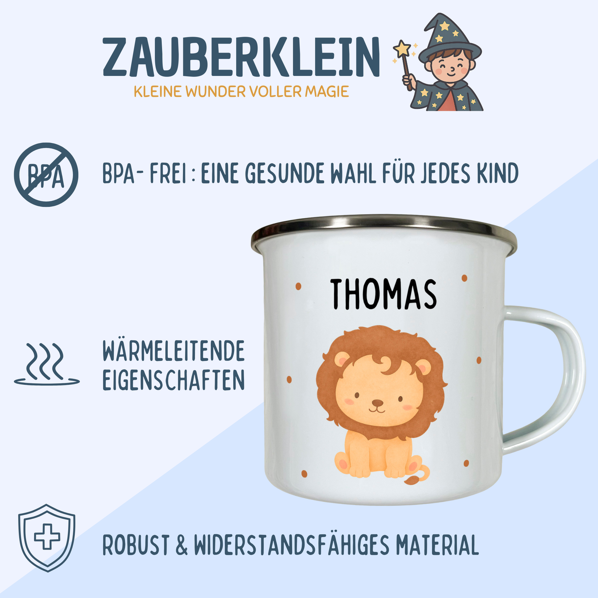 Unsere personalisierte Emaille-Tasse von Zauberklein ist ideal für den täglichen Gebrauch am Frühstückstisch, für kleine Snack-Momente oder das Lieblingsgetränk zuhause. Sie ist leicht, robust und wird mit dem Namen personalisiert zu einem ganz besonderen Lieblingsstück, das Kinder jeden Tag mit Freude benutzen.