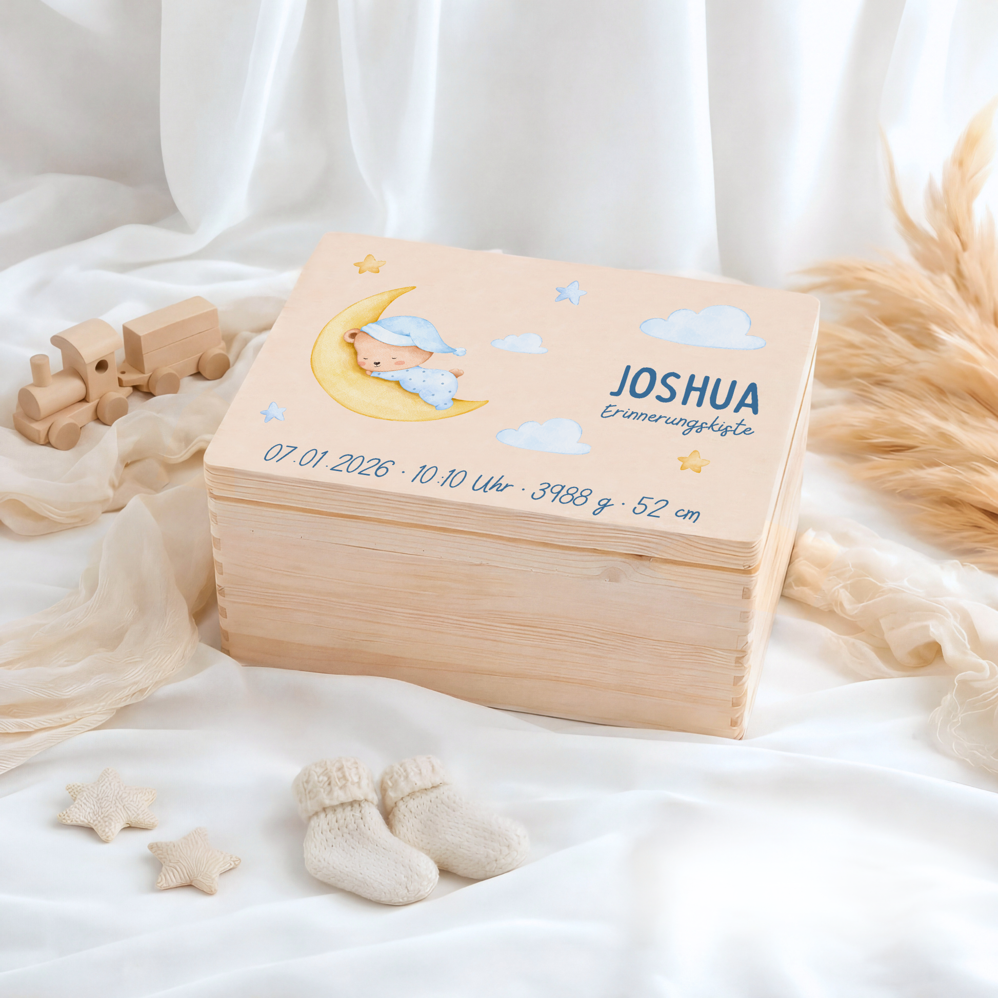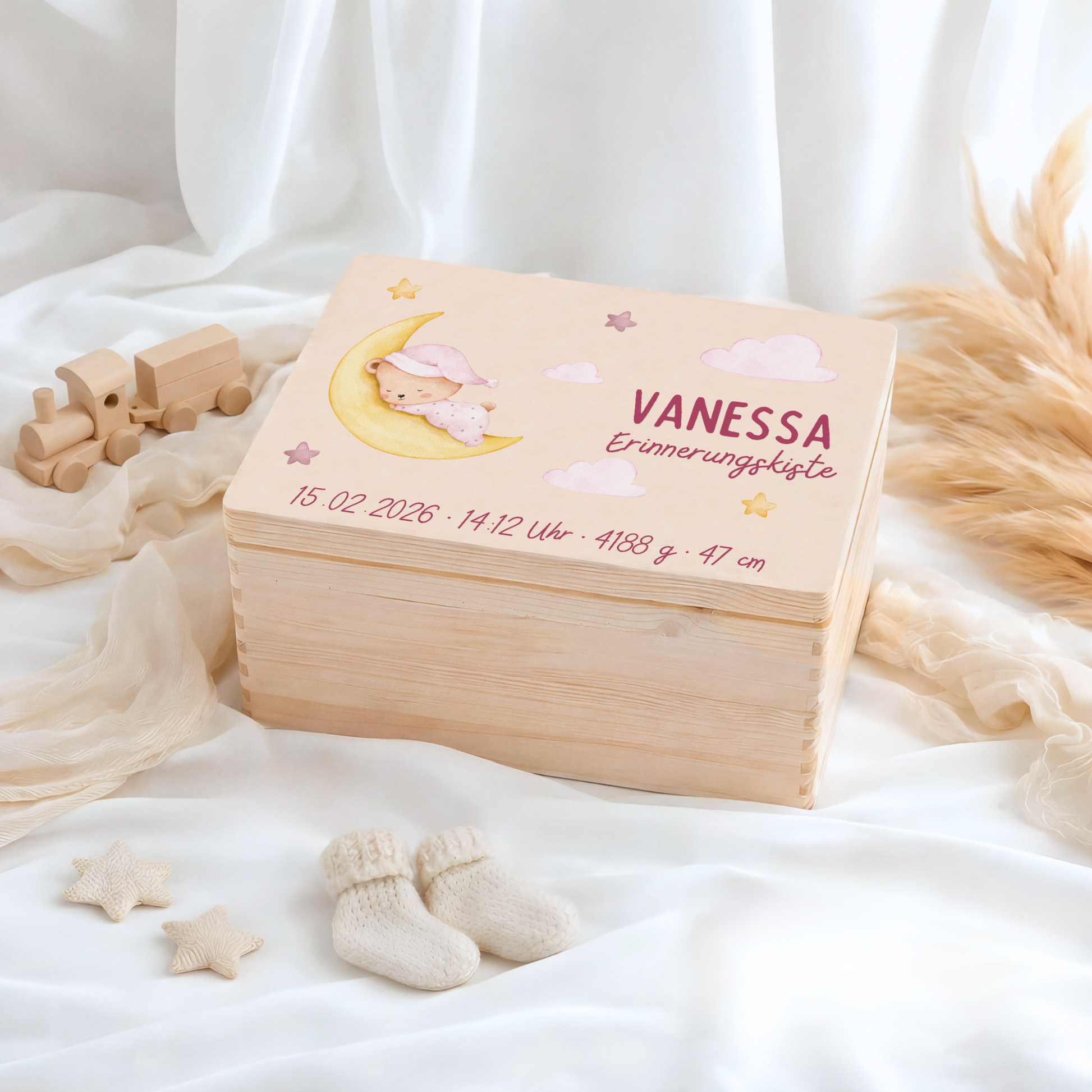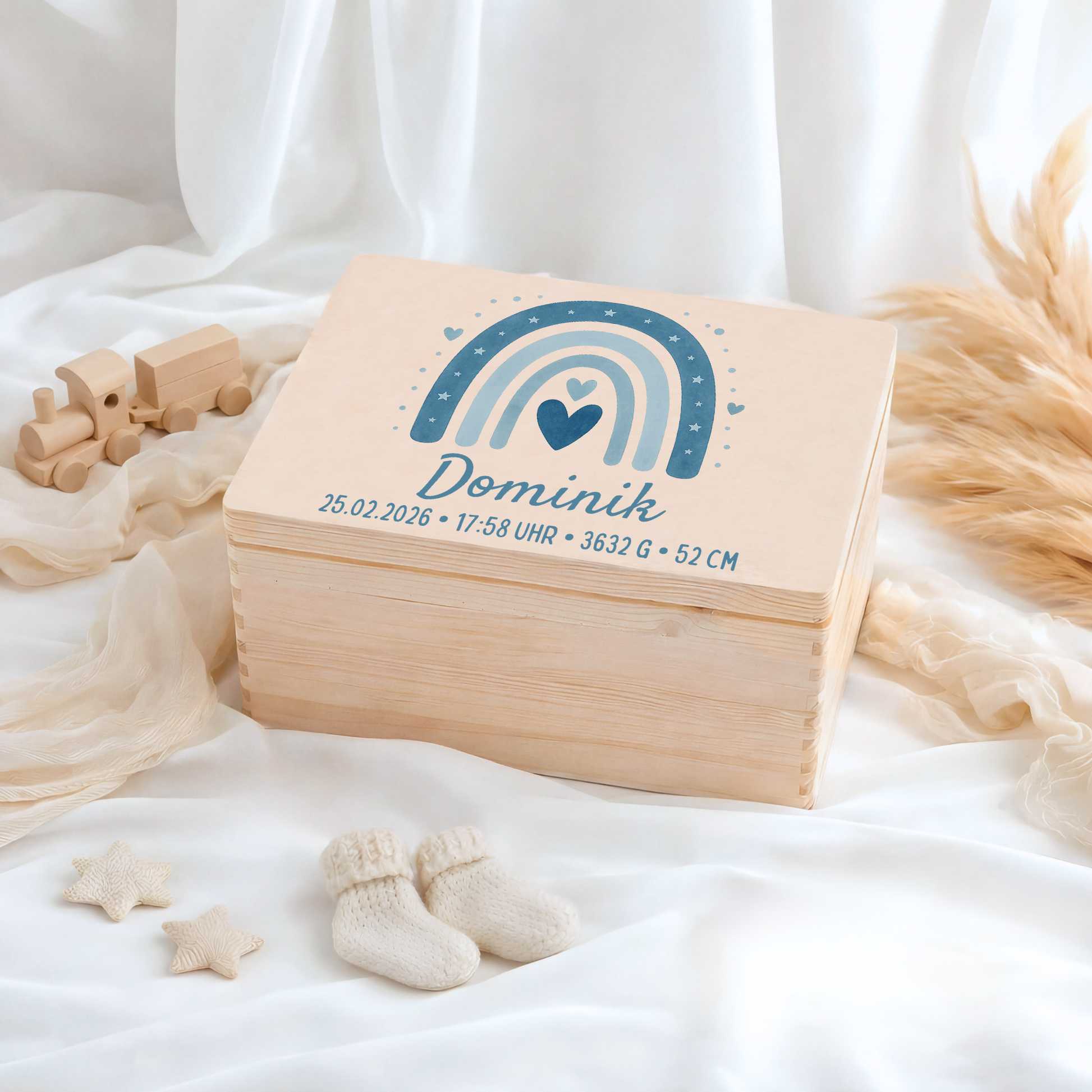 Durch die Personalisierung wird die Kiste zu einem einzigartigen Geschenk zur Geburt, Taufe, Babyparty oder zum Geburtstag – emotional, hochwertig und bedeutungsvoll.