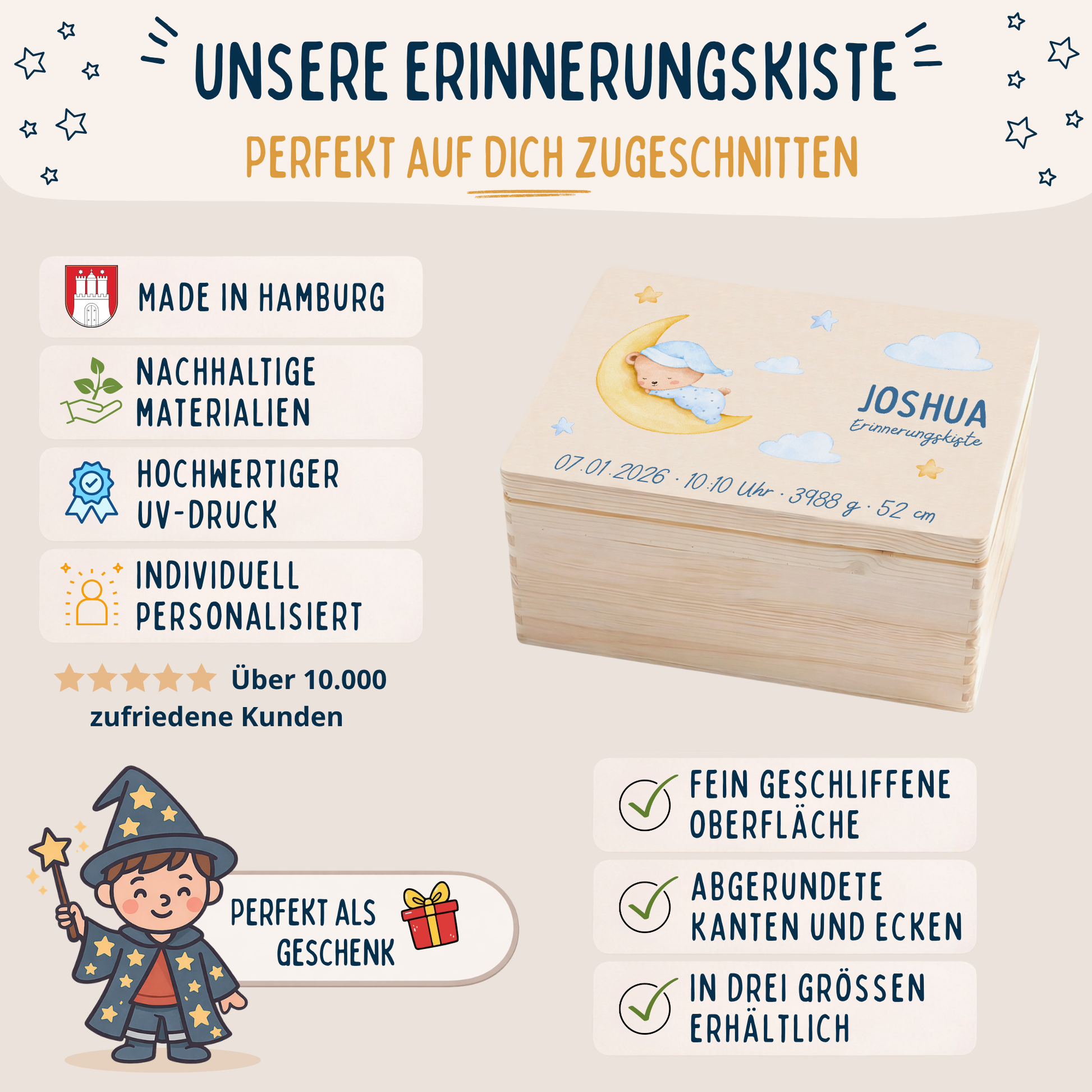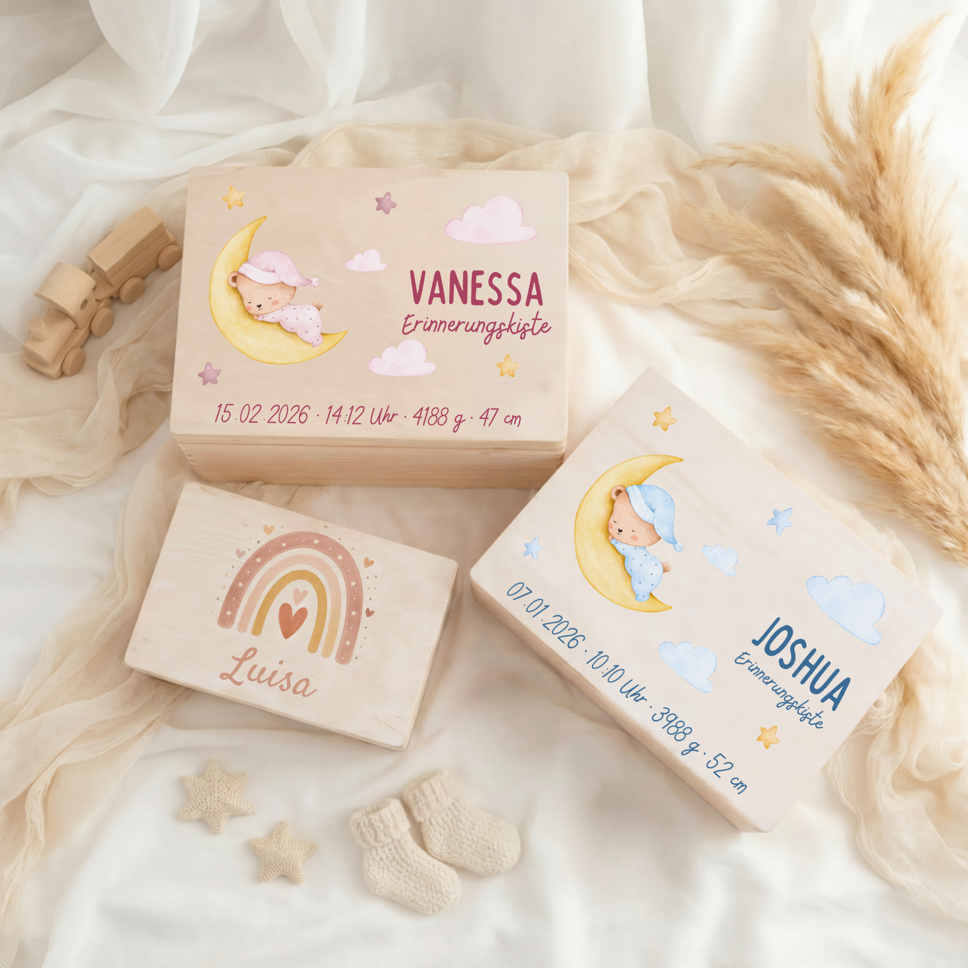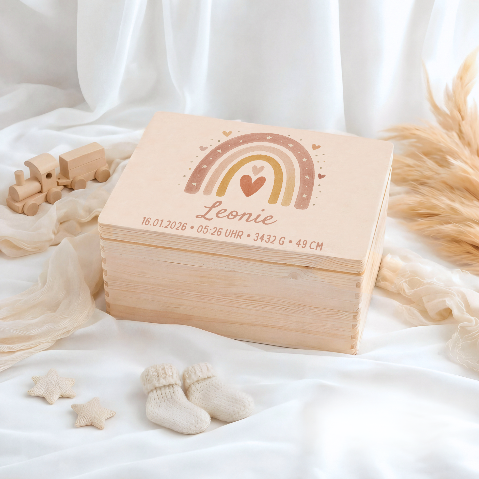 Durch die Personalisierung wird die Kiste zu einem einzigartigen Geschenk zur Geburt, Taufe, Babyparty oder zum Geburtstag – emotional, hochwertig und bedeutungsvoll.